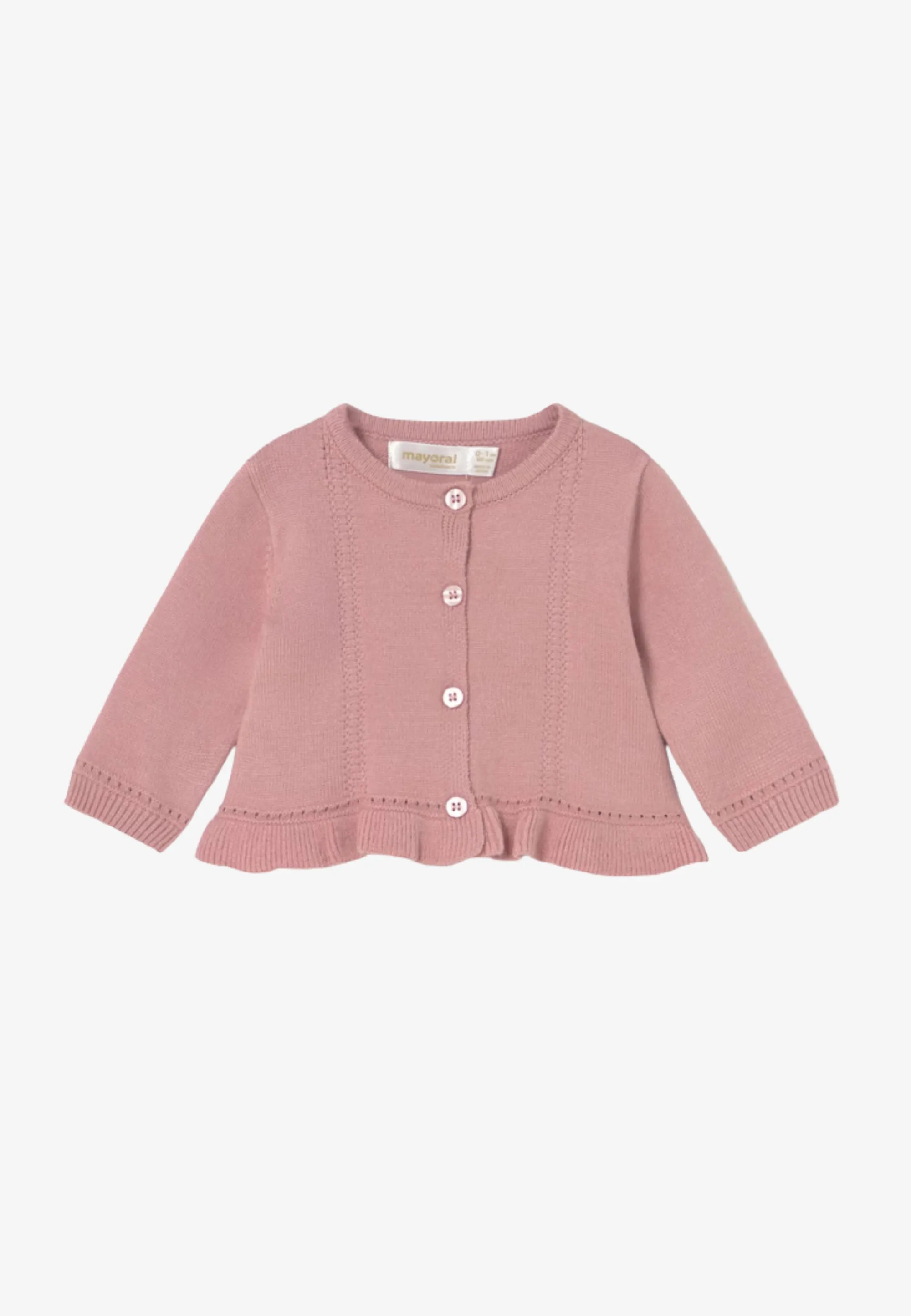 • sweter: długi rękaw, okrągły dekolt, zapinany na guziki, dekoracyjna falbanka na dole,