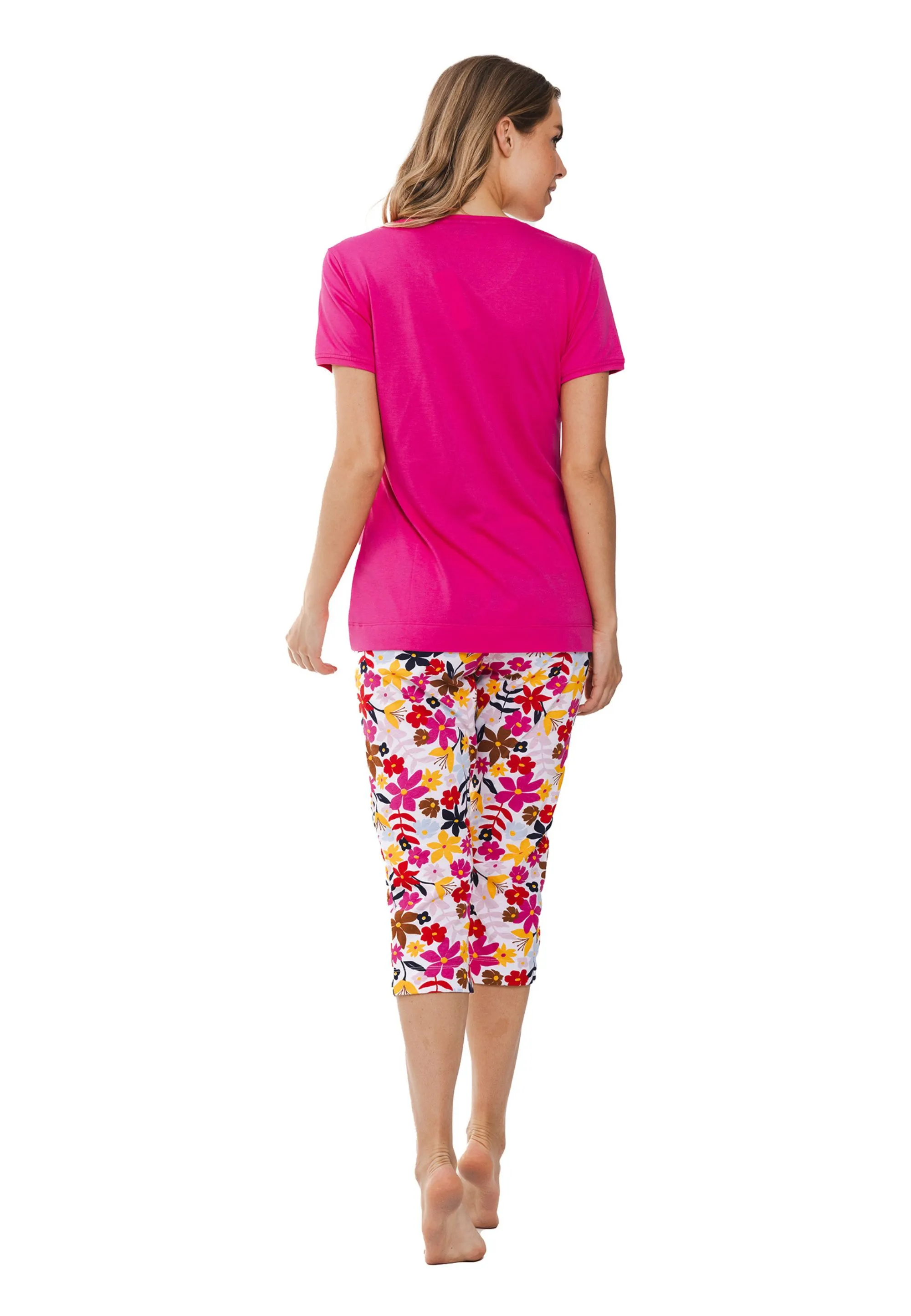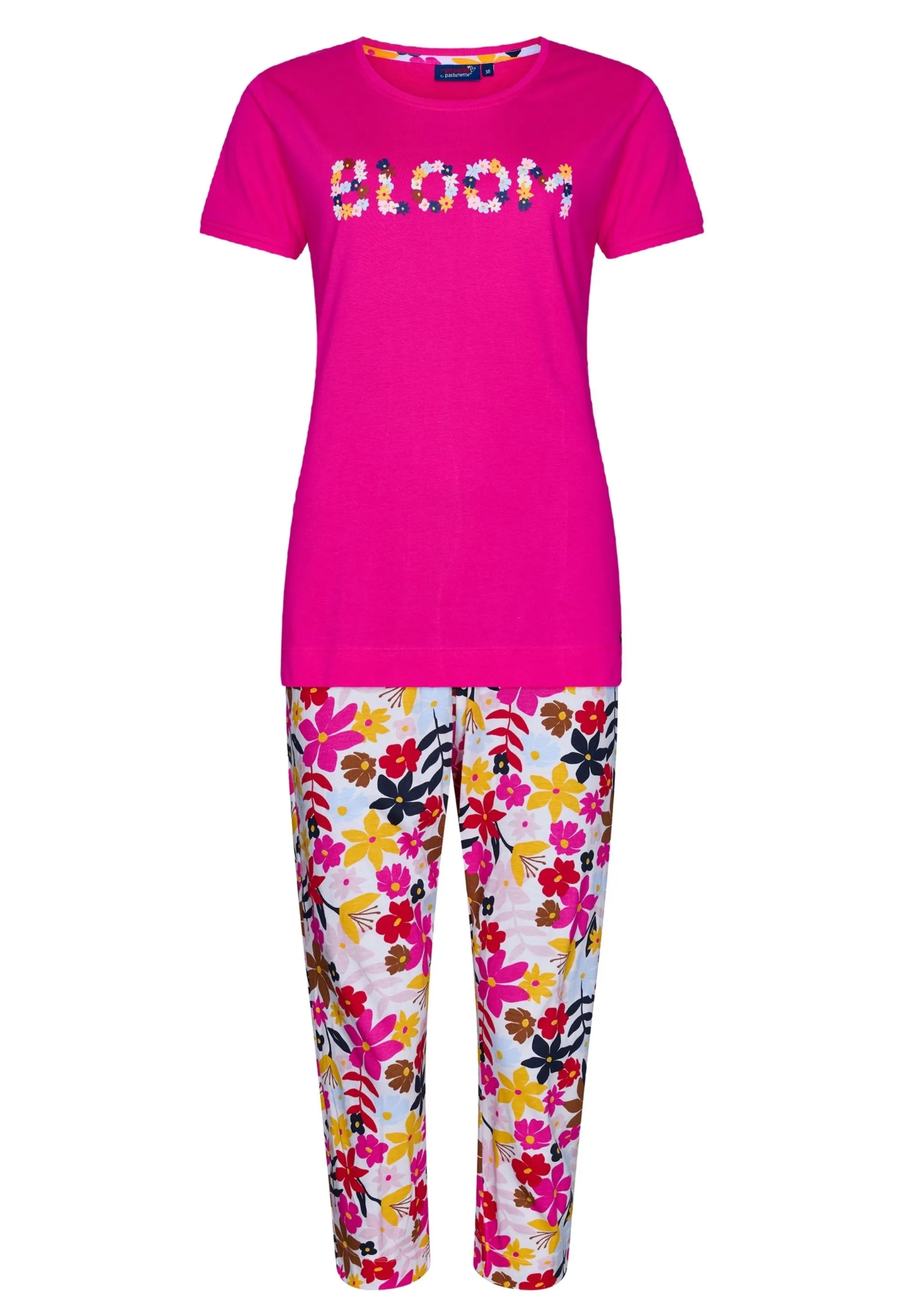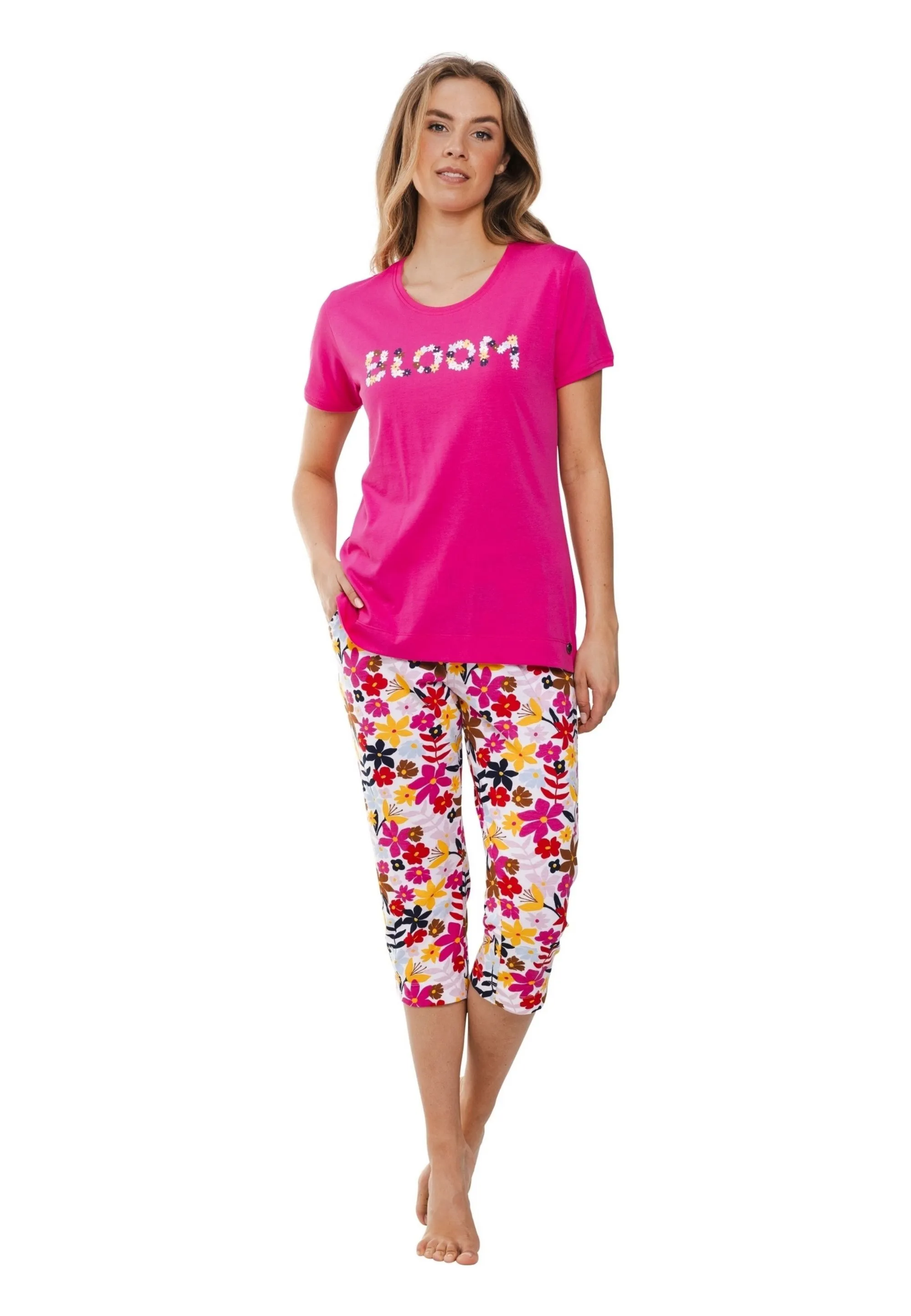 • spodnie: nogawka 3/4, elastyczna gumka w pasie, kwiatowy wzór,